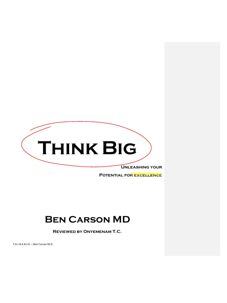 You can also purchase this book from a vendor and ship it to our address: Ben carson first amazed the world with his story, gifted hands. One needs to recognize these talents as gifts. Ben carson prescribes his personal formula for success. The author of this book knows about hardship. What we can all do to save america's future. Unleashing your potential for excellence. In think big he starts to outline principles of success and the power of taking considered and calculated risks. He struggled with a violent temper. Unleashing your potential for excellence: This book is for you if you have no dreams at all. Once all the boys read the book, ( i had the bigger boys help the younger boys read the book think big)it really opened there minds to see how special dr.ben carson is. This book is for you if you have no dreams at all.